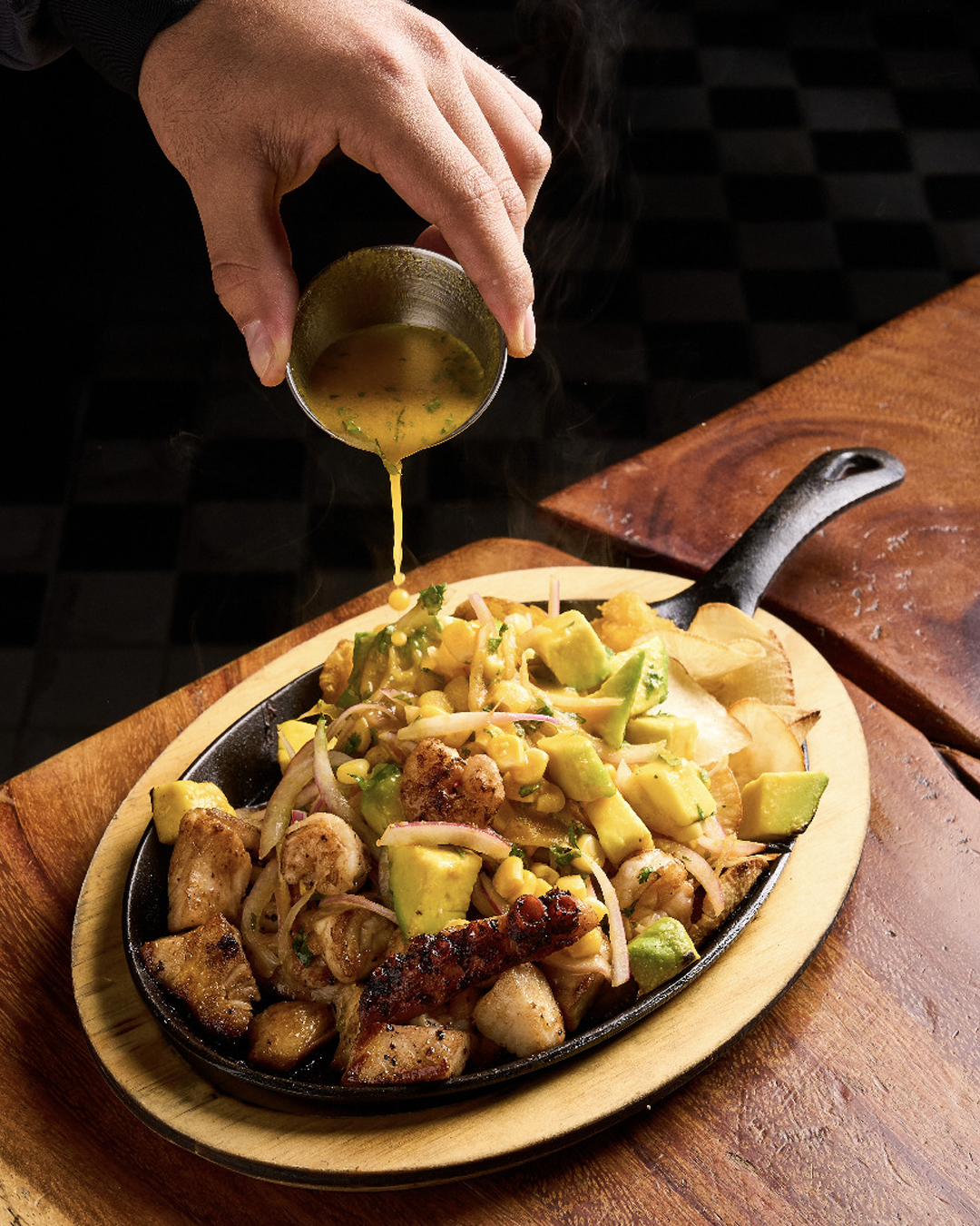 Nuestro Ceviche Parrillado son Camarones, pulpo y cubos de pescado sellados a la parrilla con leche de tigre al ají amarillo, acompañado de palta, maíz choclo, chips de yuca y papa criolla crocante.