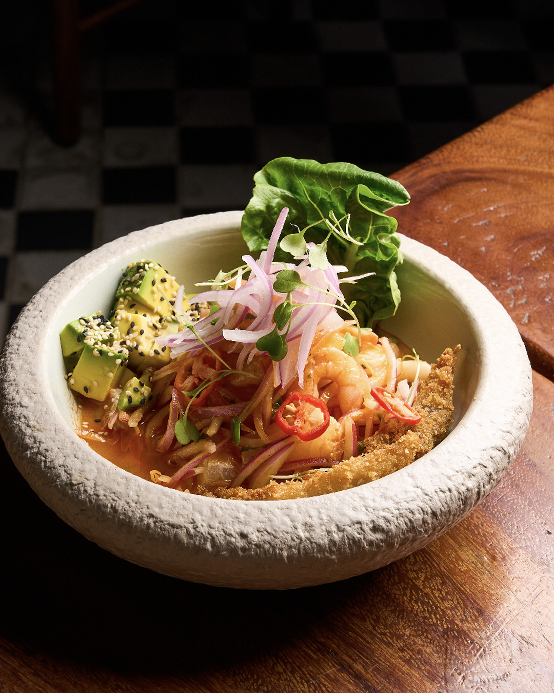 Nuestro Rocoto es Pescado, calamar, camarón y palta en leche de tigre al ají rocoto, acompañado de pescado crocante.
